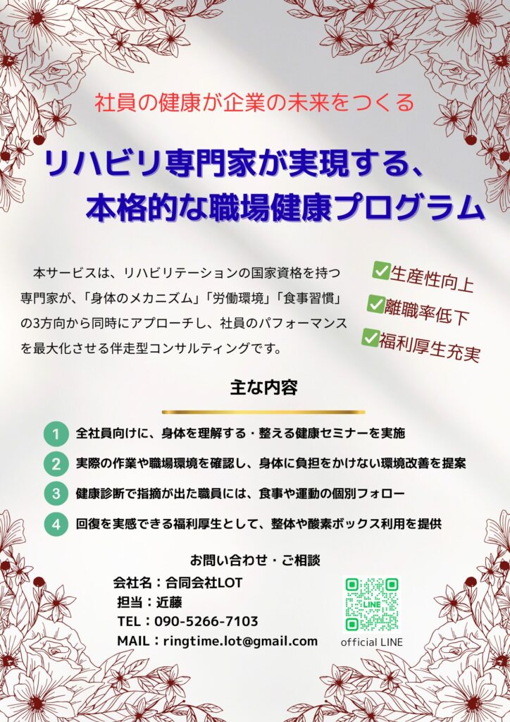 病院や整体院に来られる多くの方が、背景には就労時の負担による影響が捨てきれません。そのため、就労環境や就労時の小まめな身体のメンテナンスが非常に重要になります。